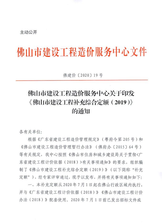 佛山市建設工程造價服務中心關于印發《佛山市建設工程補充綜合定額(2019)》的通知