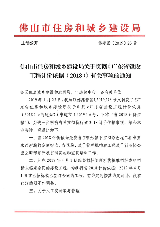 佛山市住房和城鄉(xiāng)建設(shè)局關(guān)于貫徹《廣東省建設(shè)工程計(jì)價(jià)依據(jù)(2018)》有關(guān)事項(xiàng)的通知