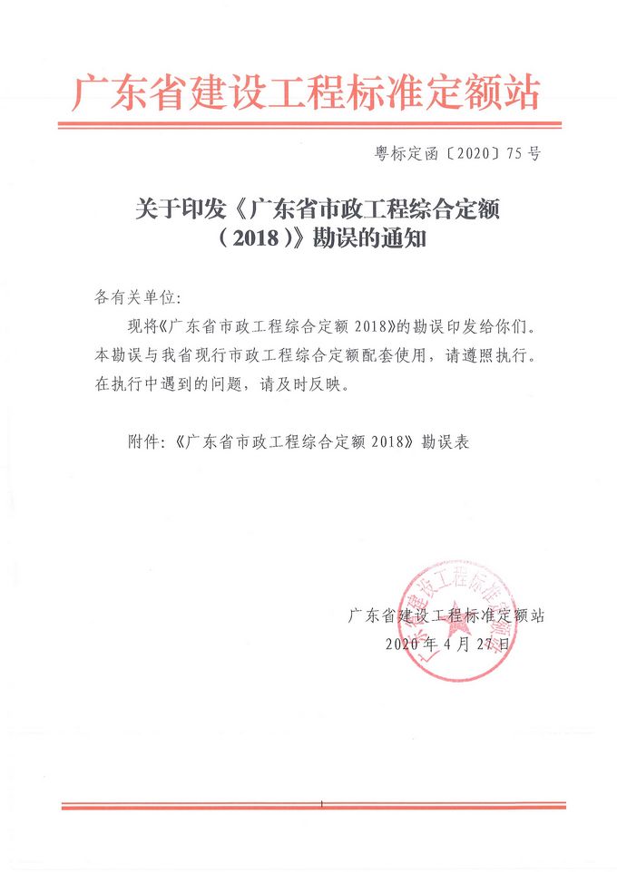 關于印發《廣東省市政工程綜合定額 (2018)》勘誤的通知