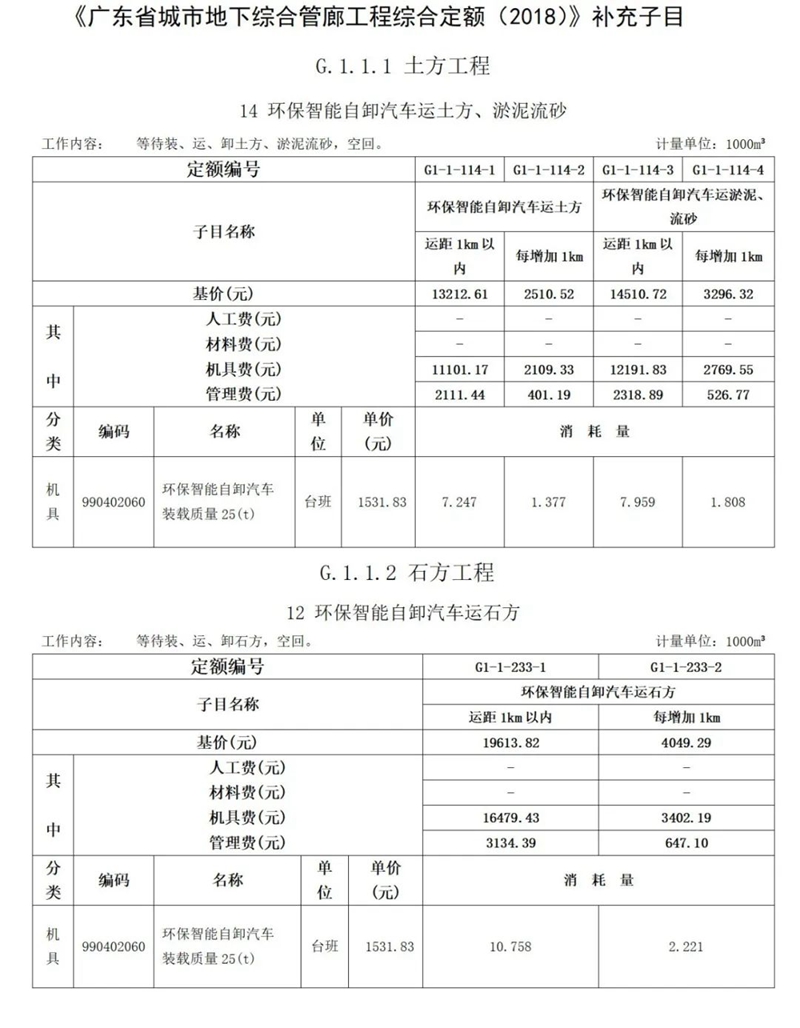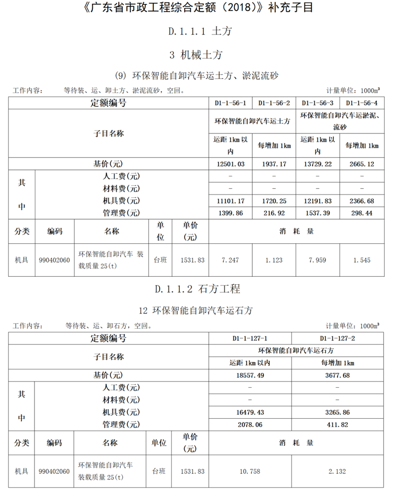 3.本補充定額子目機械臺班單價參照《廣東省建設(shè)工程施工機具臺班費用編制規(guī)則2018》“990402060 環(huán)保智能自卸汽車”計取;管理費參照《廣東省城市軌道交通工程綜合定額2018》《廣東省市政工程綜合定額2018》《廣東省城市地下綜合管廊工程綜合定額2018》“附錄二 管理費分攤費率表”中相關(guān)專業(yè)冊管理費分攤費率計取。