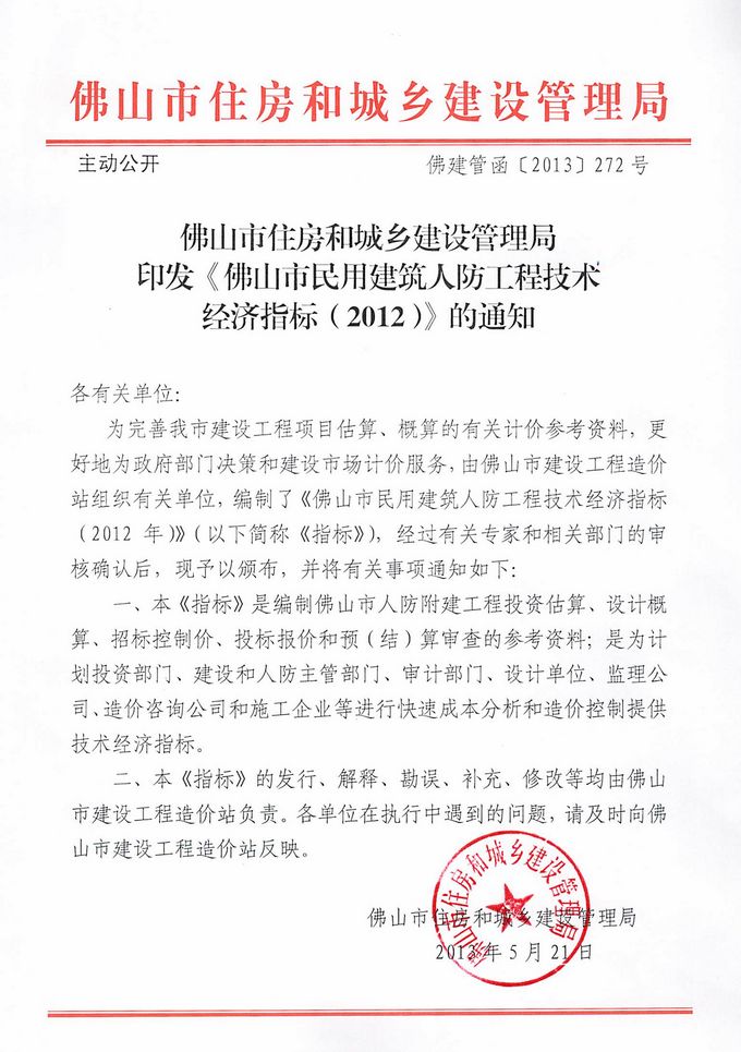 佛山市住房和城鄉建設管理局印發《佛山市民用建筑人防工程技術經濟指標(2012)》的通知