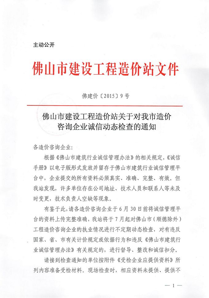 佛山市建設(shè)工程造價站關(guān)于對我市造價咨詢企業(yè)誠信動態(tài)檢查的通知