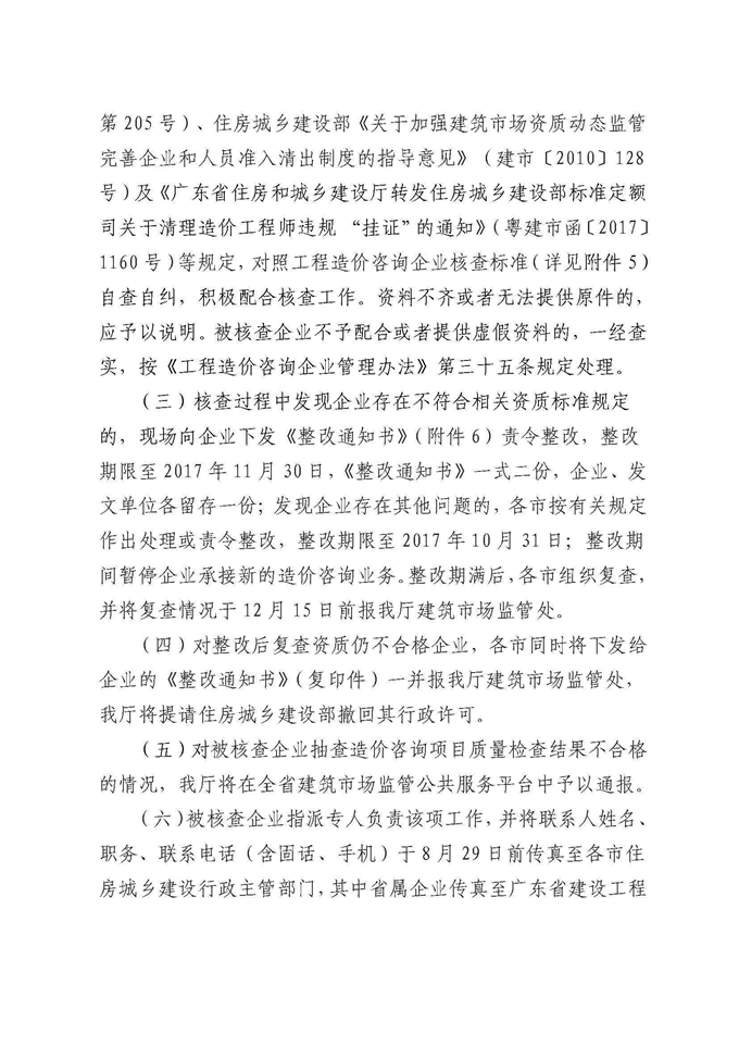 附件:1.2017年造價咨詢企業資質(資信)動態核查企業名單2.工程造價咨詢企業資質核查表3.工程造價咨詢項目質量檢查表4.工程造價咨詢企業資質核查和咨詢項目質量檢查結果匯總表5.工程造價咨詢企業核查標準6.整改通知書