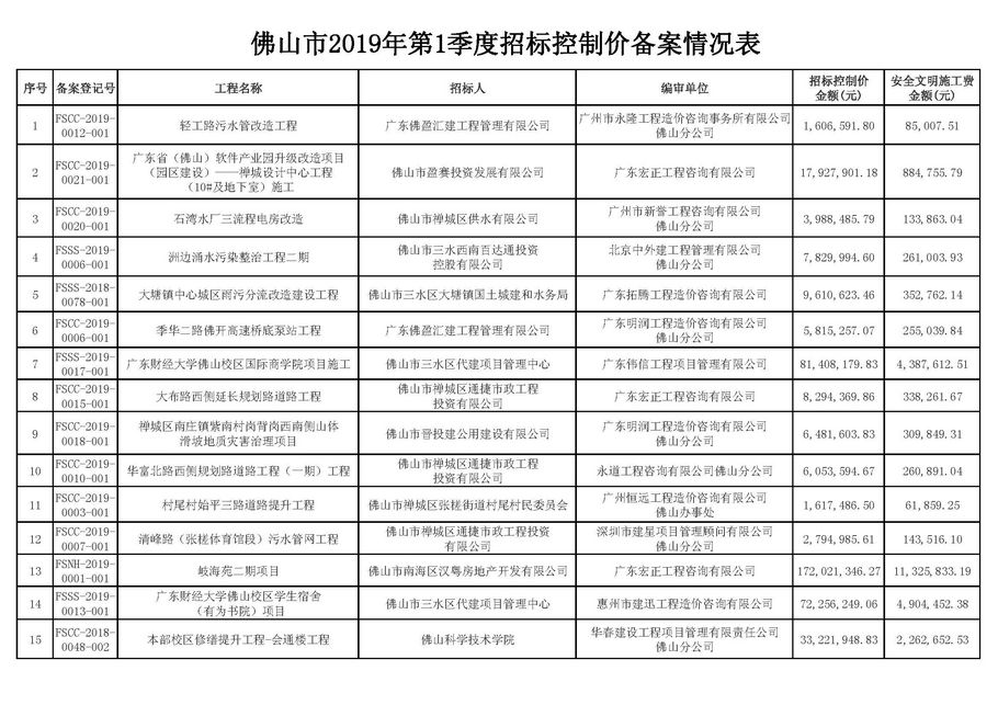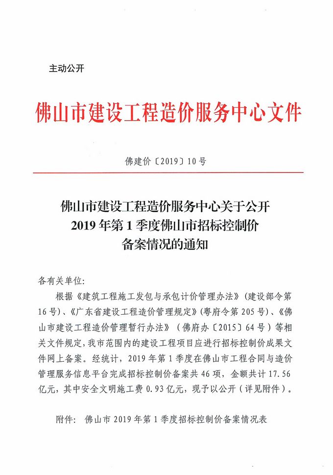 佛山市建設工程造價服務中心關于公布2019年第1季度佛山市招標控制價備案情況的通知