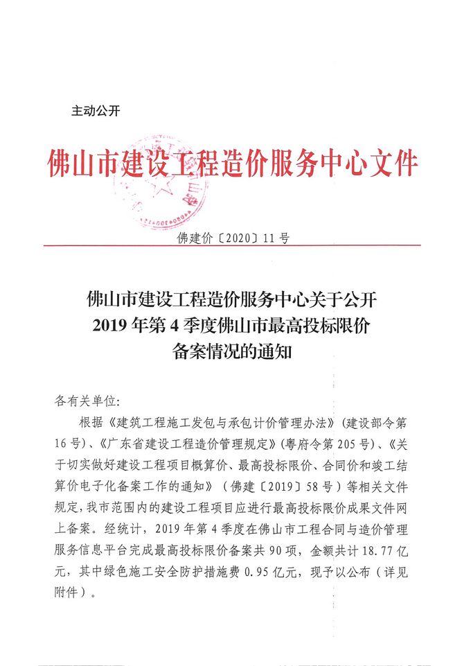 佛山市建設工程造價服務中心關于公開2019年第4季度佛山市招標控制價備案情況的通知