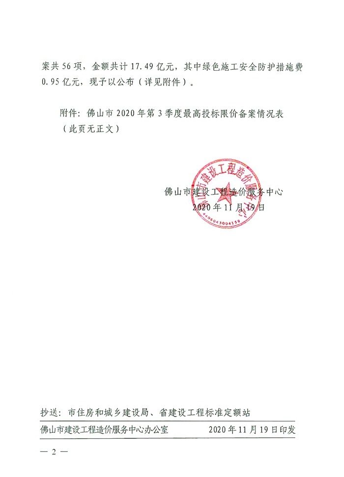 佛山市建設(shè)工程造價(jià)服務(wù)中心關(guān)于公開2020年第3季度佛山市最高投標(biāo)限價(jià)備案情況的通知