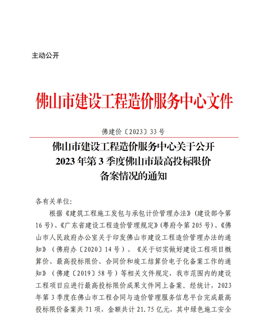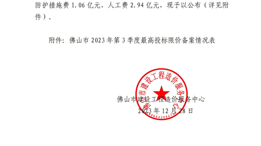 轉發 | 佛山市建設工程造價服務中心關于公開2023年第3季度佛山市最高投標限價備案情況的通知