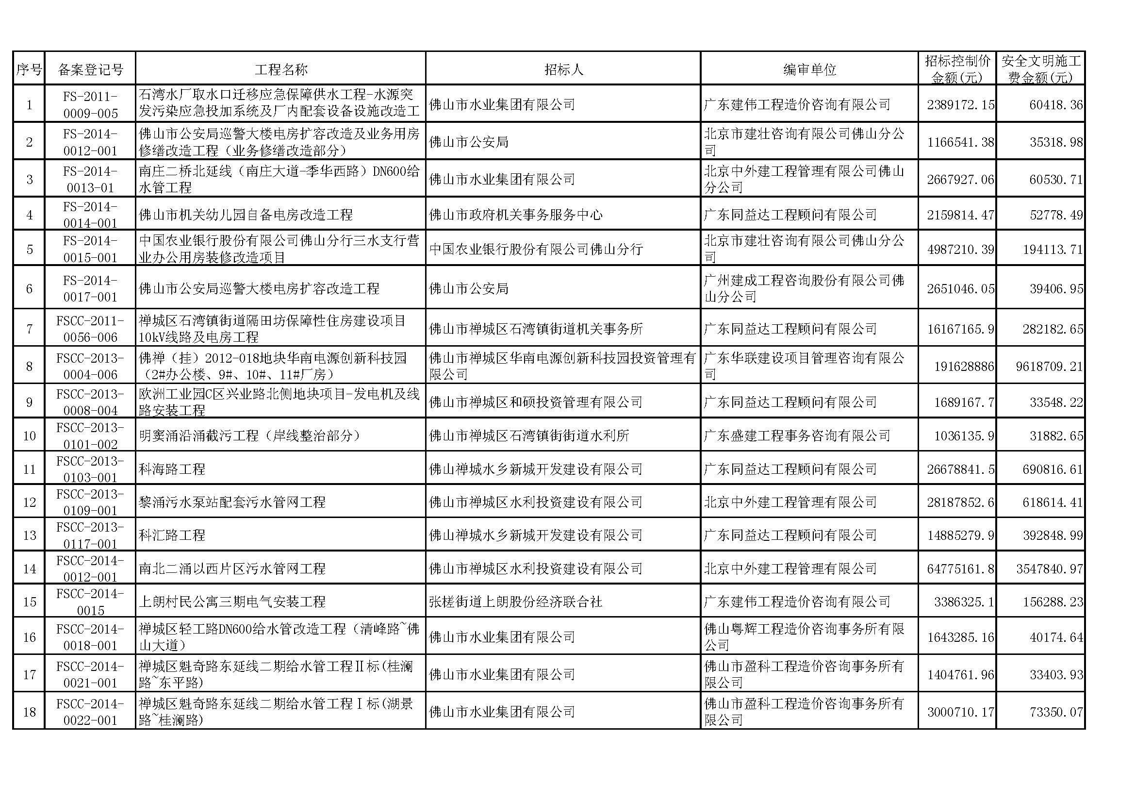 佛山市招標控制價備案情況表(2014-07-01至2014-09-30)