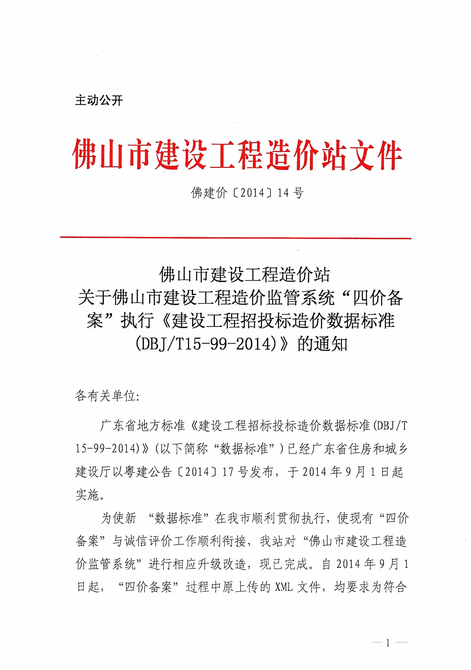 關(guān)于佛山市建設(shè)工程造價監(jiān)管系統(tǒng)“四價備案”執(zhí)行《建設(shè)工程招投標(biāo)造價數(shù)據(jù)標(biāo)準(zhǔn)(DBJ/T15-99-2014)》的通知