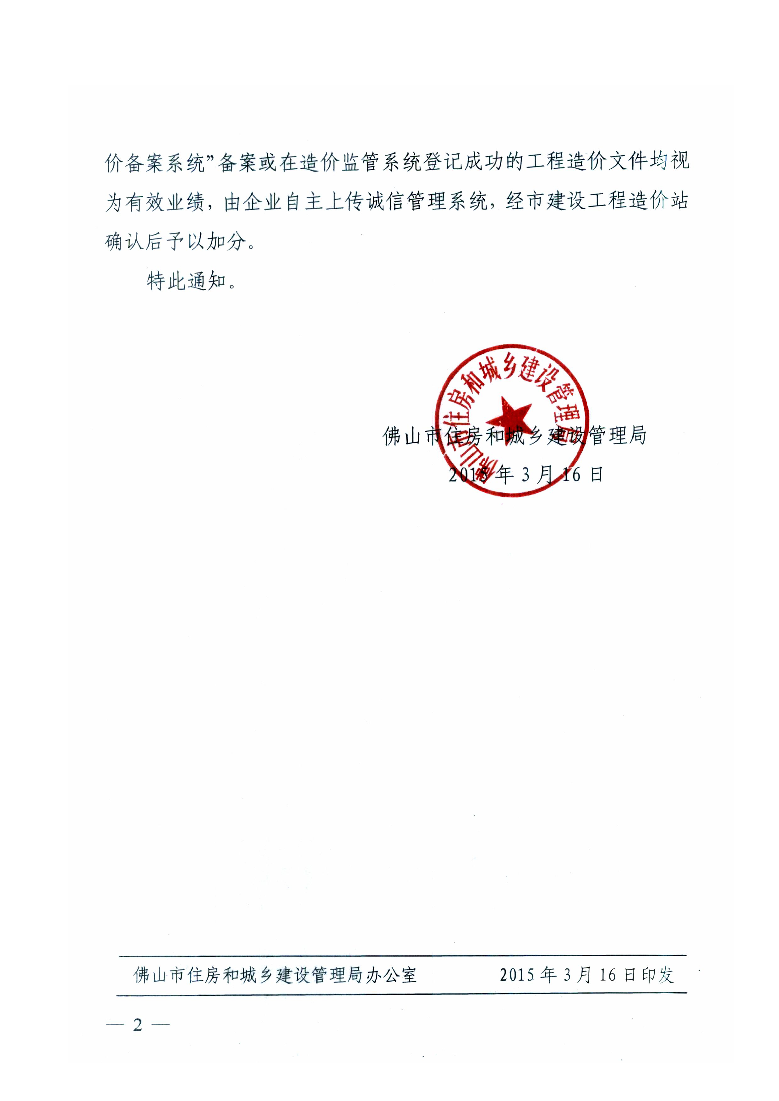 佛山市住房和城鄉建設管理局關于工程造價咨詢企業誠信綜合考評中有關業績登記確認的通知