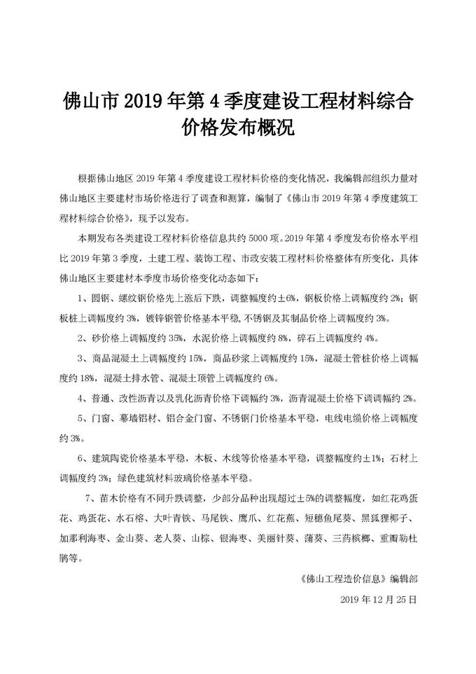 佛山市2019年第4季度建設(shè)工程材料綜合價(jià)格發(fā)布概況