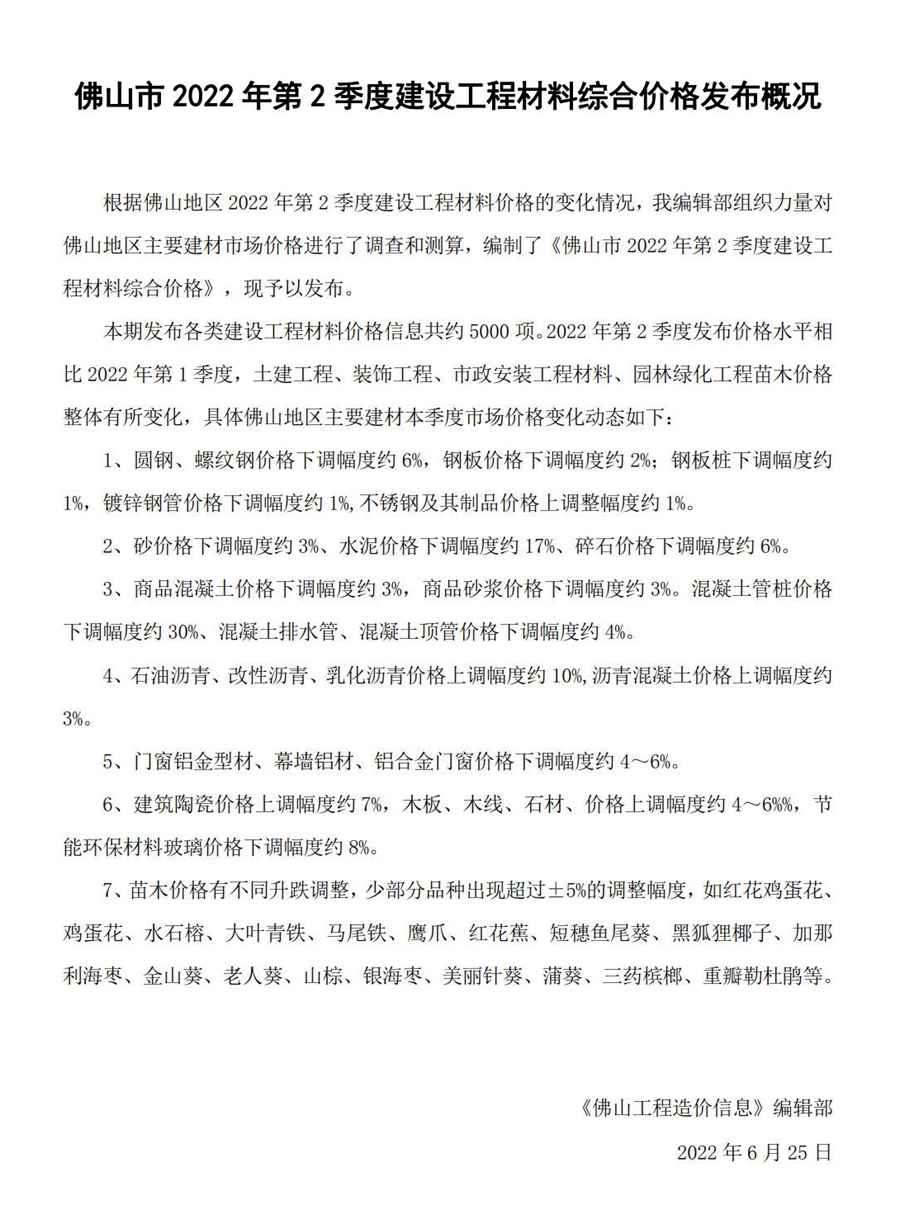 佛山市2022年第2季度建設工程材料綜合價格發(fā)布概況
