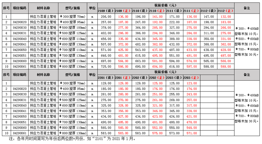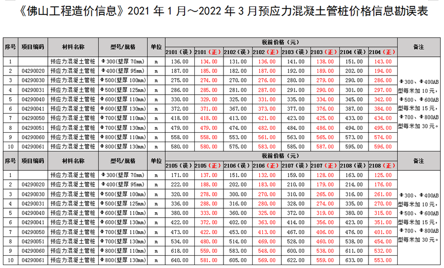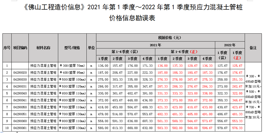 《佛山工程造價信息》2021年第1季度~2022年第1季度預應力混凝土管樁價格信息勘誤表