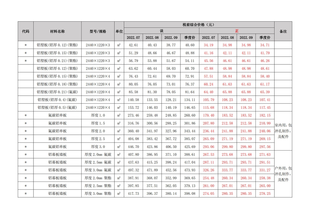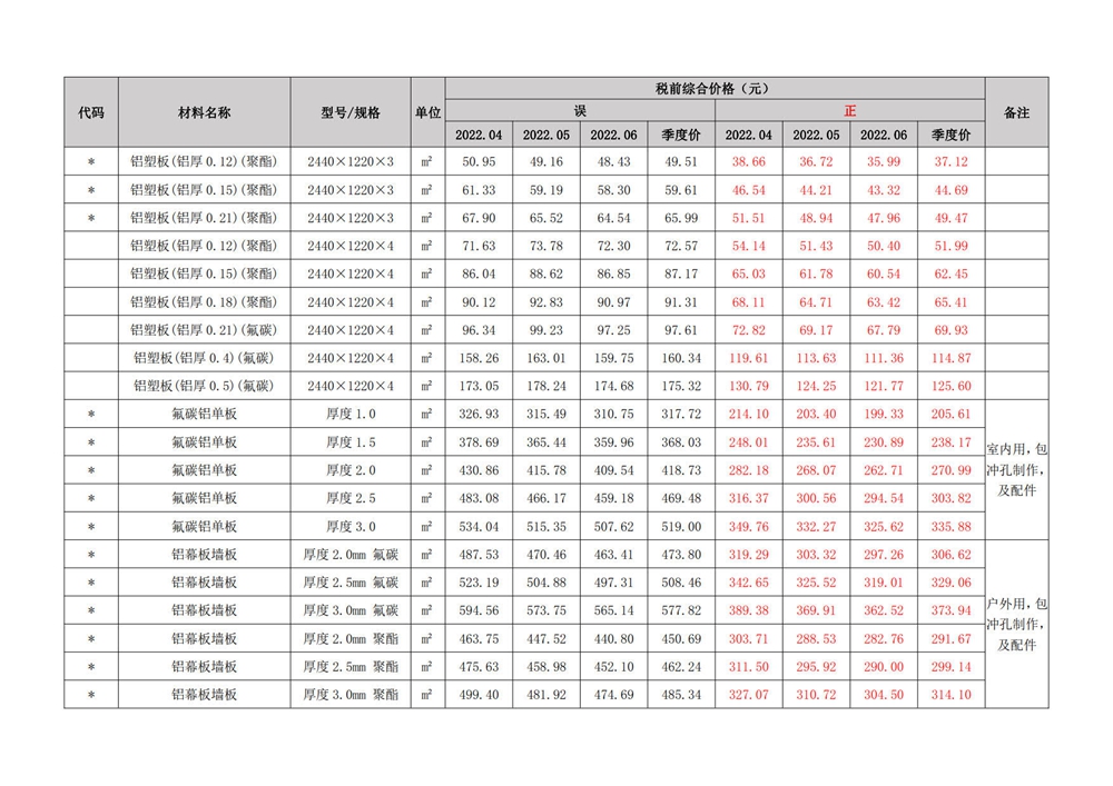 《佛山工程造價信息》2021年1季度至2022年4季度部分裝飾材料價格信息勘誤表