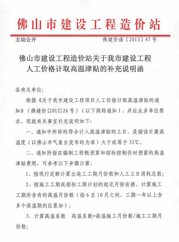 佛山市建設工程造價站關于我市建設工程人工價格計取高溫津貼的補充說明函