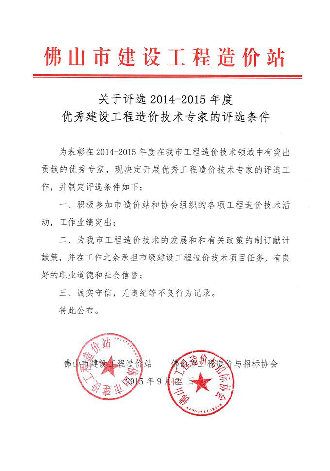 關于評選2014-2015年度優(yōu)秀建設工程造價技術專家的評優(yōu)條件
