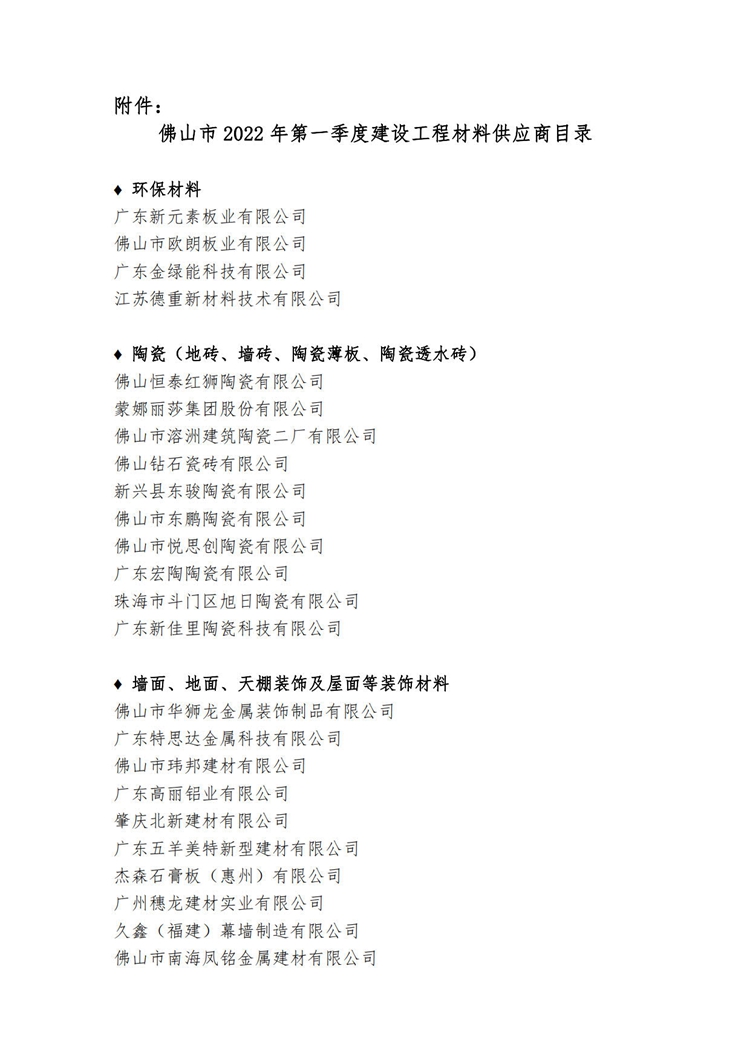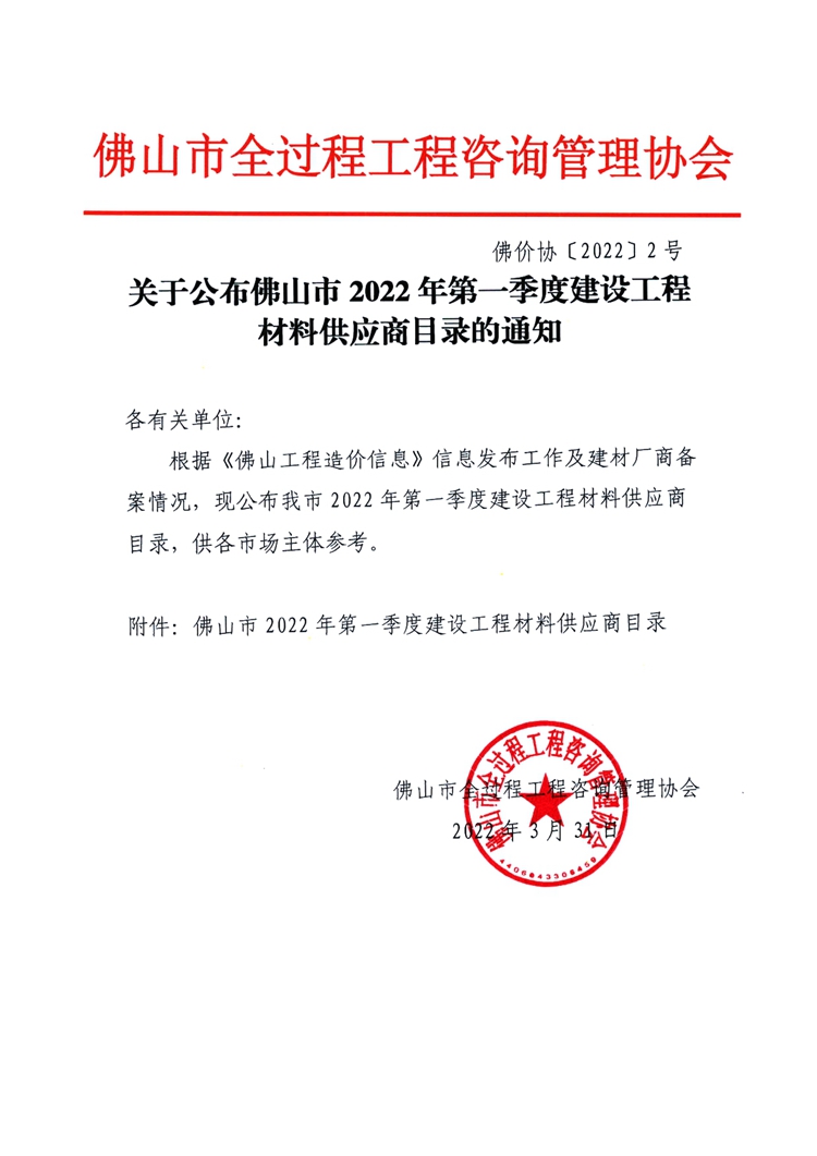 關(guān)于公布佛山市2022年第一季度建設(shè)工程材料供應(yīng)商目錄的通知