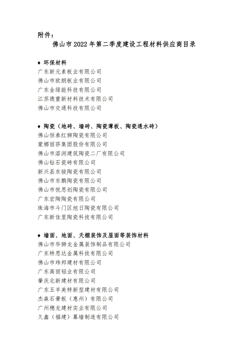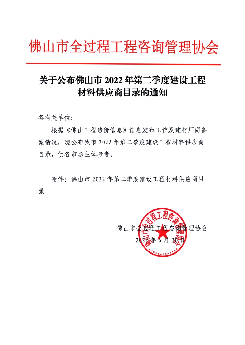 關(guān)于公布佛山市2022年第二季度建設(shè)工程材料供應(yīng)商目錄的通知
