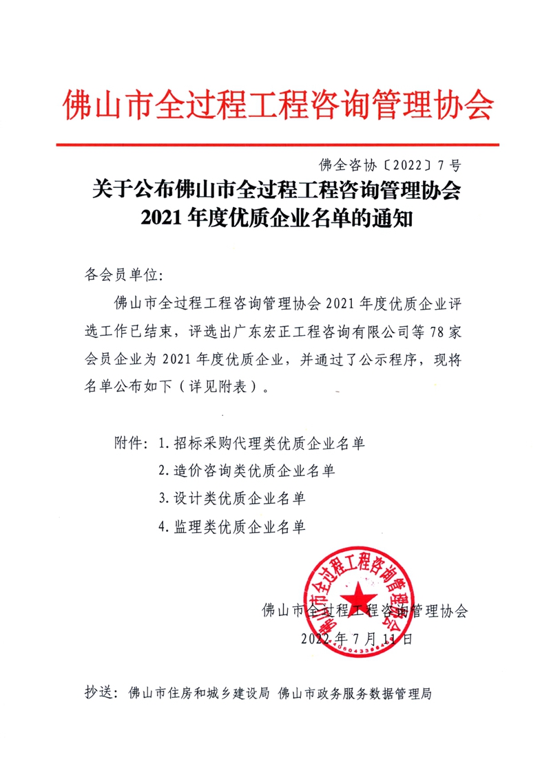 關(guān)于公布佛山市全過程工程咨詢管理協(xié)會(huì)2021年度優(yōu)質(zhì)企業(yè)名單的通知