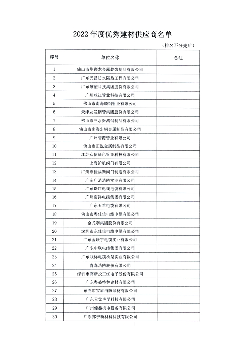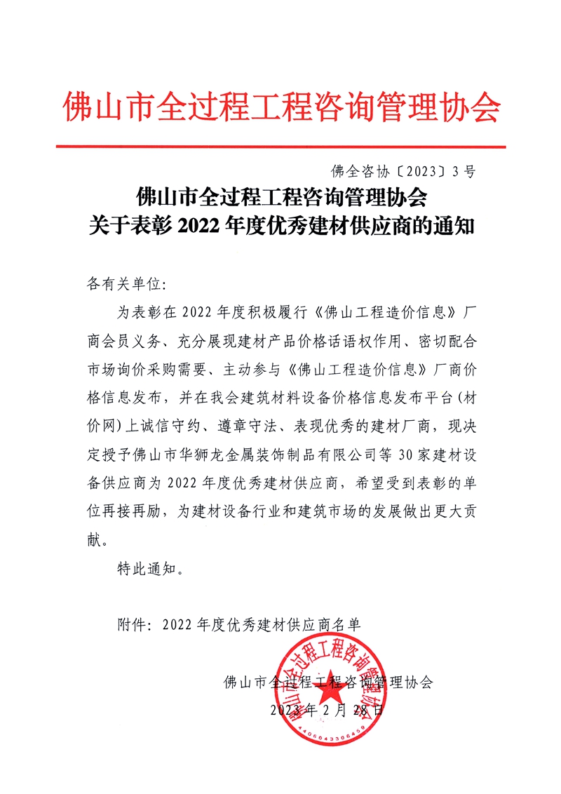 佛山市全過程工程咨詢管理協會關于表彰2022年度優秀建材供應商的通知