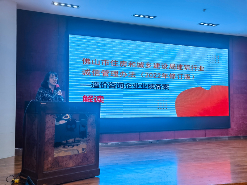 會議首先由佛山市建設工程造價服務中心造價監測室負責人鄒錦對《佛山市住房和城鄉建設局建筑行業誠信管理辦法(2022年修訂版)》和“造價咨詢企業業績備案”進行了宣講,鄒科圍繞《辦法》的修改背景、政策要點、變化和亮點、誠信評價方式、企業加/扣分標準、誠信評價結果的應用等內容進行了詳細解讀,結合《佛山市建設工程造價監管和信用檔案系統》的“造價咨詢企業業績備案”,講解了業績備案的文件上傳要求、填報注意事項、得分計算規則、動態管理與查詢公布方式等。