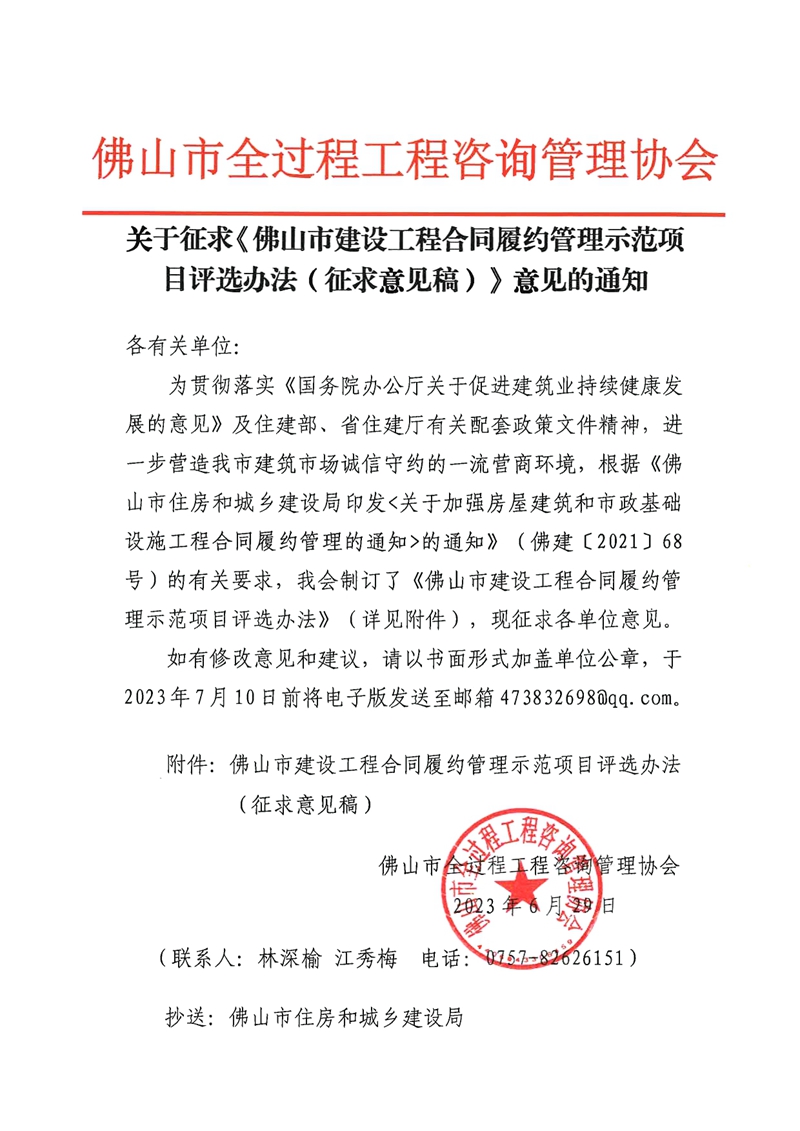 關于征求《佛山市建設工程合同履約管理示范項目評選辦法(征求意見稿)》意見的通知