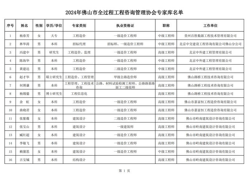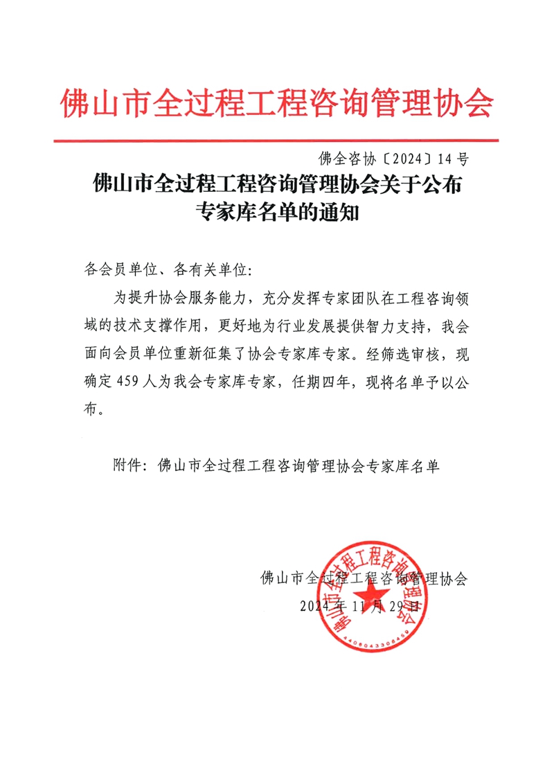 佛山市全過程工程咨詢管理協會關于公布專家庫名單的通知