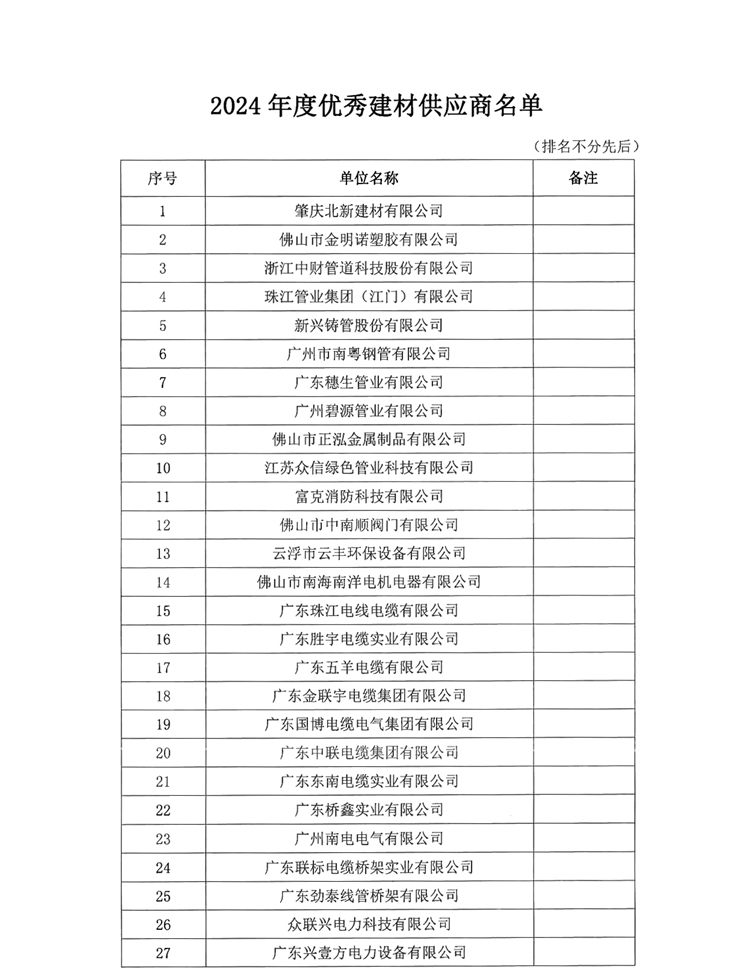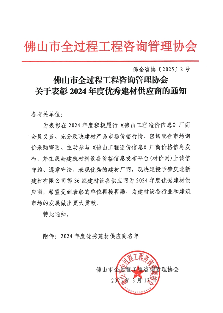 佛山市全過程工程咨詢管理協會關于表彰2024年度優秀建材供應商的通知