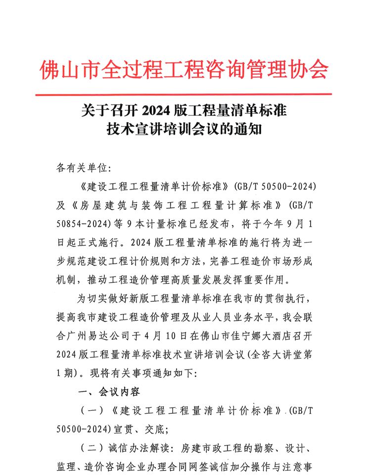 關于召開2024版工程量清單標準技術宣講培訓會議的通知