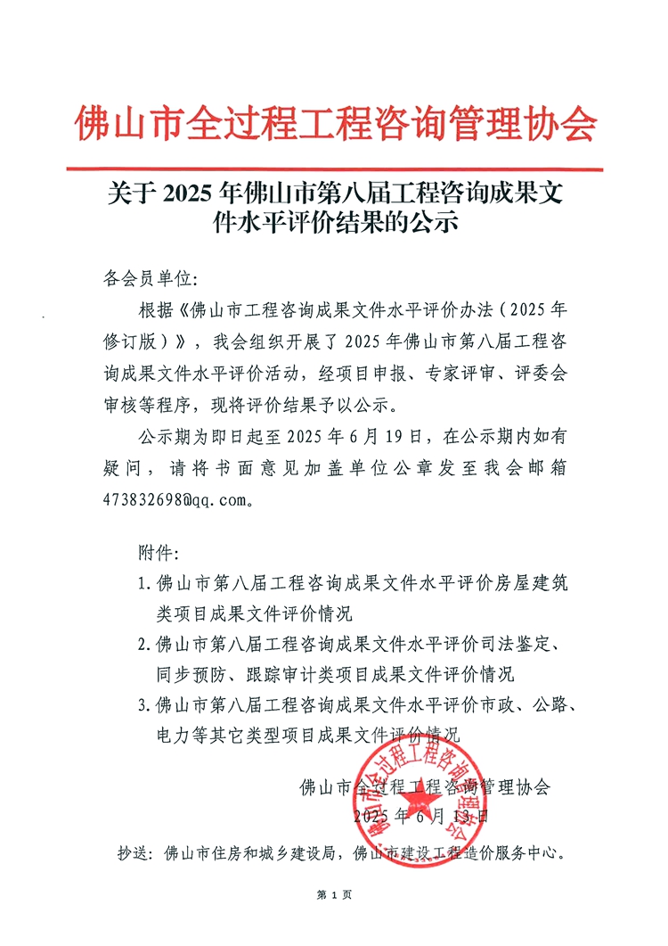 關(guān)于2025年佛山市第八屆工程咨詢成果文件水平評價(jià)結(jié)果的公示