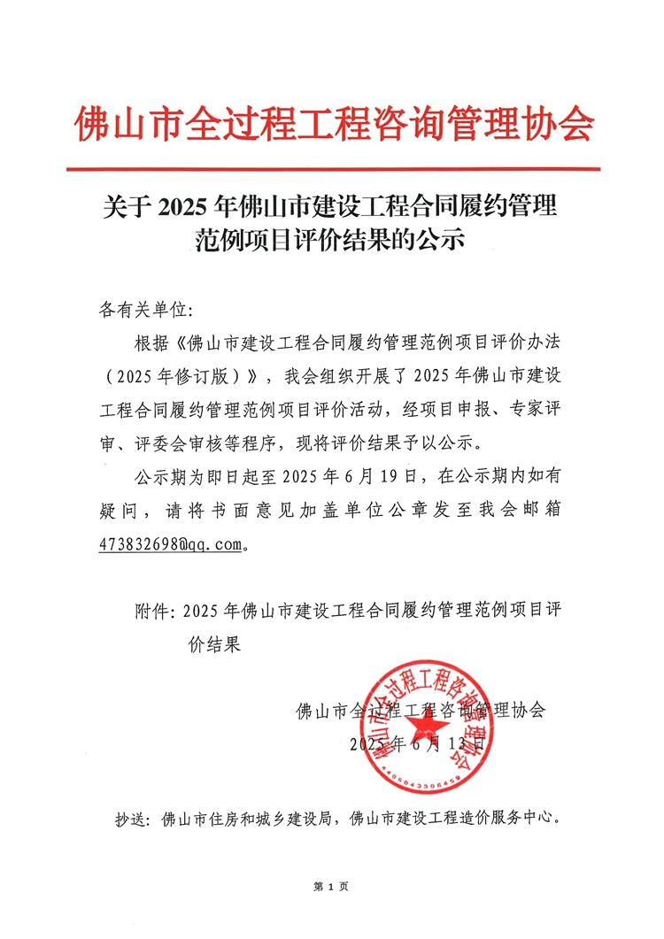 關于2025年佛山市建設工程合同履約管理范例項目評價結果的公示