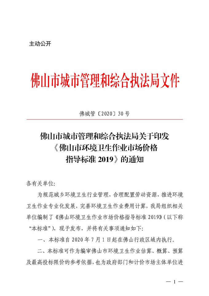 佛山市城市管理和綜合執法局關于印發《佛山市環境衛生作業市場價格指導標準2019》的通知
