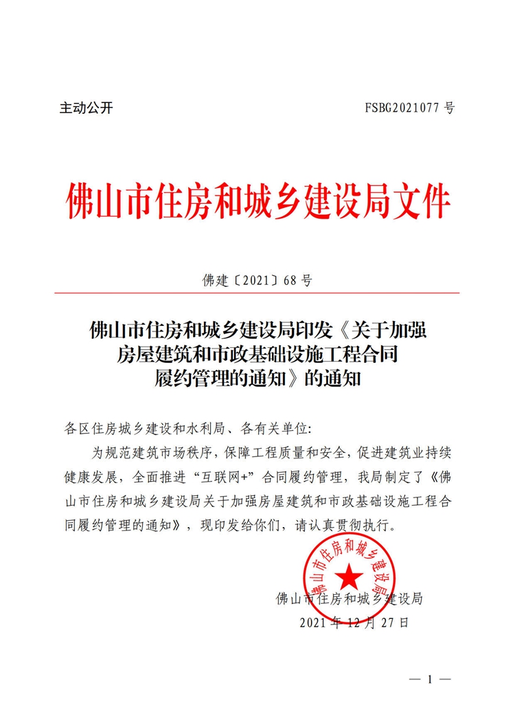 佛山市住房和城鄉建設局印發《關于加強房屋建筑和市政基礎設施工程合同履約管理的通知》的通知
