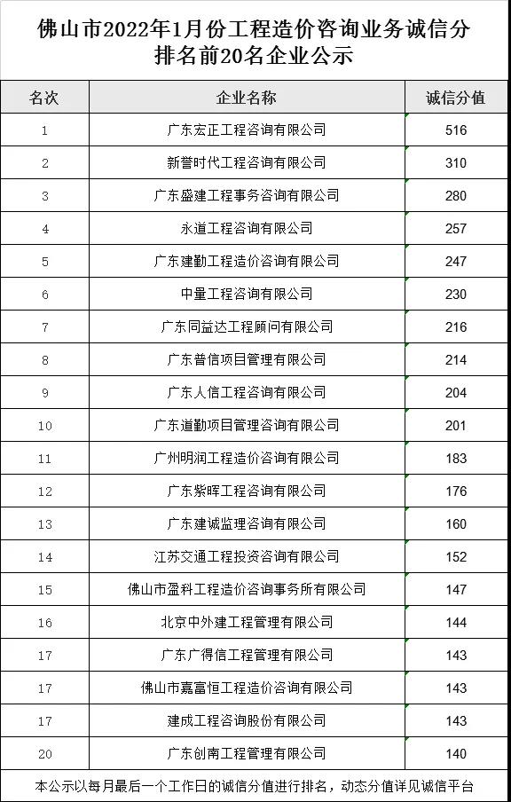 佛山市2022年1月份工程造價(jià)咨詢業(yè)務(wù)誠(chéng)信分排名前20名企業(yè)公示