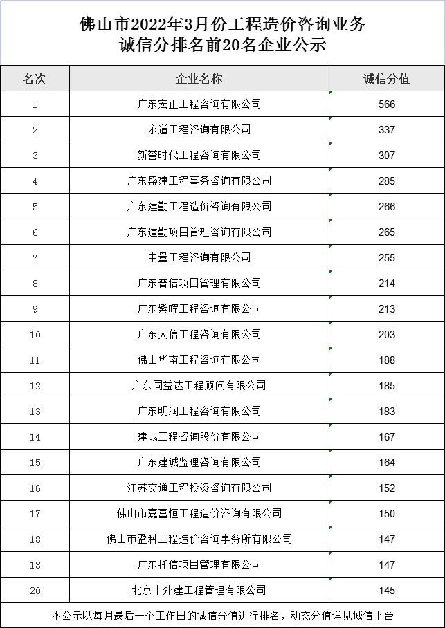 佛山市2022年3月份工程造價咨詢業務誠信分排名前20名企業公示