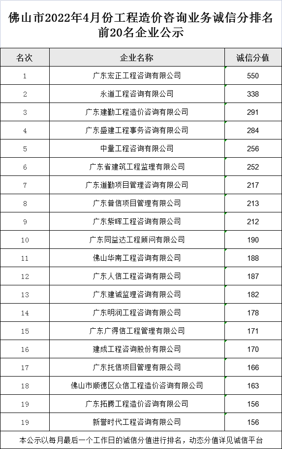 佛山市2022年4月份工程造價咨詢業務誠信分排名前20名企業公示