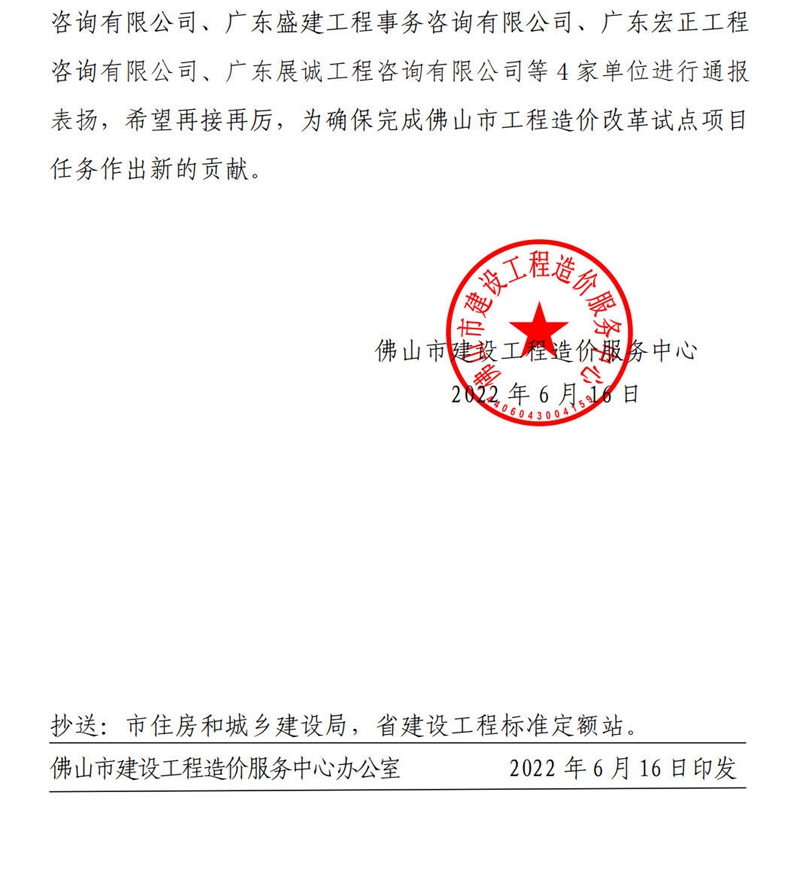 佛山市建設工程造價服務中心關于對工程造價改革試點項目技術輔導的支持單位進行通報表揚的通知