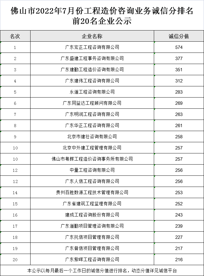佛山市2022年7月份工程造價咨詢業務誠信分排名前20名企業公示