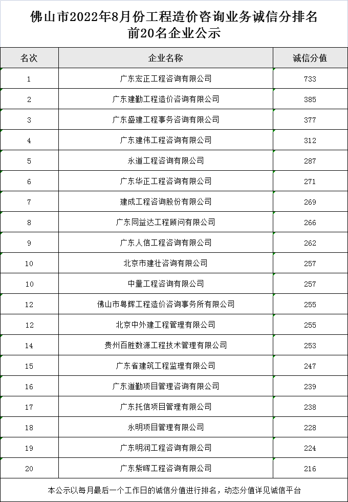 佛山市2022年8月份工程造價(jià)咨詢業(yè)務(wù)誠(chéng)信分排名前20名企業(yè)公示