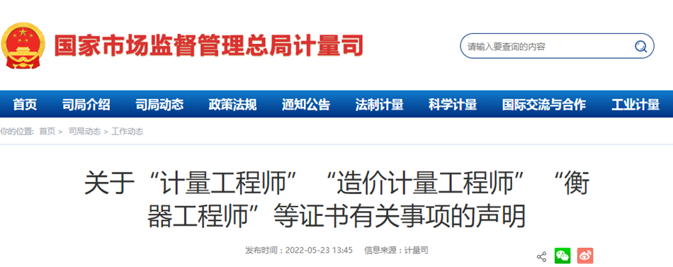 轉(zhuǎn)發(fā) | 關(guān)于“計(jì)量工程師”“造價(jià)計(jì)量工程師”“衡器工程師”等證書有關(guān)事項(xiàng)的聲明