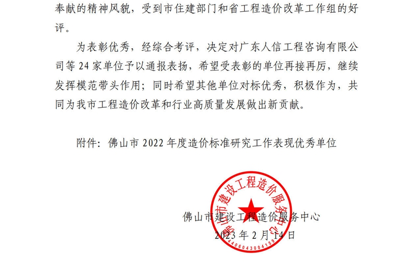 轉發 | 佛山市建設工程造價服務中心關于對2022年度造價標準研究工作表現優秀的單位進行表揚的通報