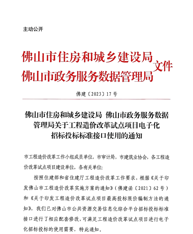 轉發 | 佛山市住房和城鄉建設局 佛山市政務服務數據管理局關于工程造價改革試點項目電子化招標投標標準接口使用的通知