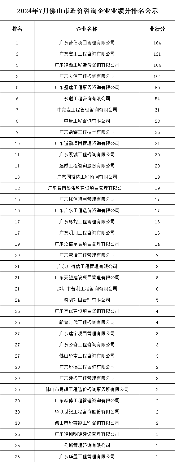 轉(zhuǎn)發(fā) | 2024年7月佛山市造價(jià)咨詢企業(yè)業(yè)績(jī)分排名公示
