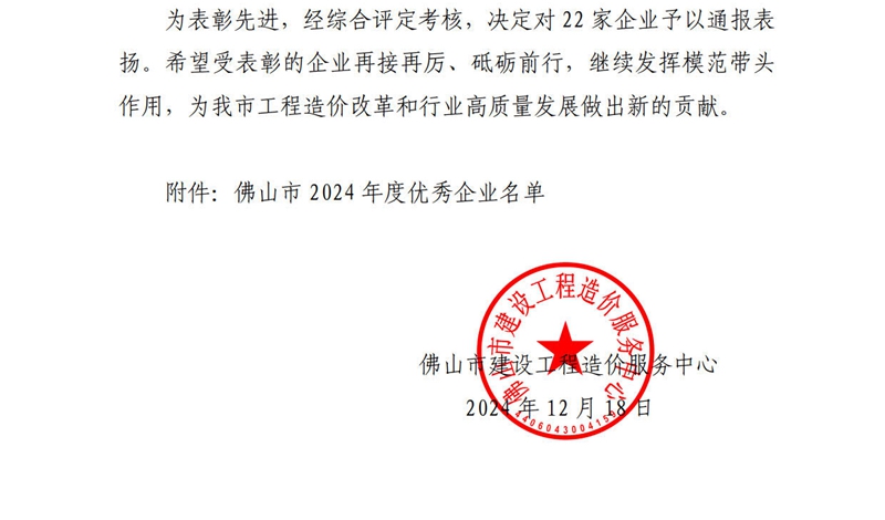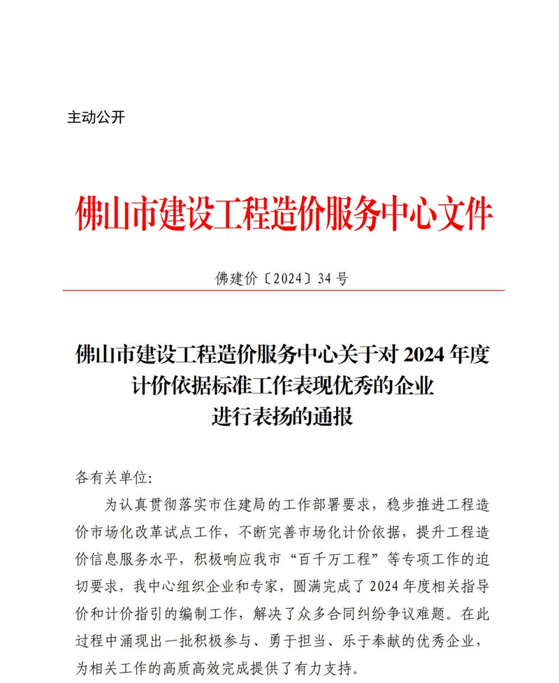 轉(zhuǎn)發(fā) | 佛山市建設(shè)工程造價服務(wù)中心關(guān)于對2024年度計價依據(jù)標(biāo)準(zhǔn)工作表現(xiàn)優(yōu)秀的企業(yè)進(jìn)行表揚的通報