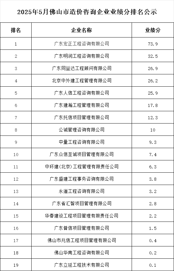 轉(zhuǎn)發(fā) | 2025年5月佛山市造價咨詢企業(yè)業(yè)績分排名公示