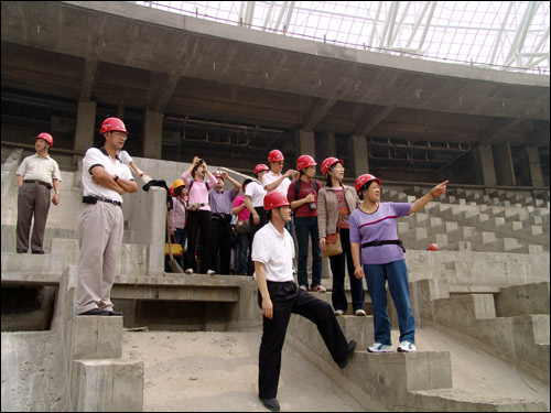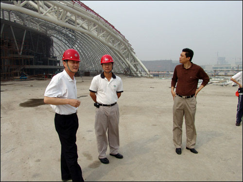 區建設局副局長李碧輝(中)在聽取天津奧林匹克中心體育館的介紹