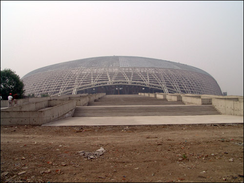 國家大劇院工程總建筑面積約16.5萬m2,總投資額約26.88億元。主體建筑由外部圍護鋼結構殼體和內部2416個坐席的歌劇院、2017個坐席的音樂廳、1040個坐席的戲劇院、公共大廳及配套用房組成。外部圍護鋼結構殼體呈半橢球形,東西軸長212米,南北軸長114米,中間沒有支撐,是目前我國跨度最大的殼體鋼結構建筑。橢球形屋面表面面積達3.6萬平方米,主要采用銀白色鈦板構成。