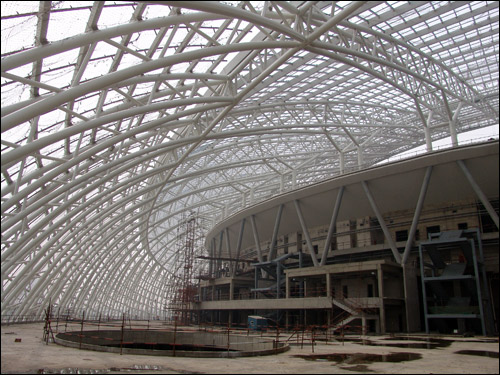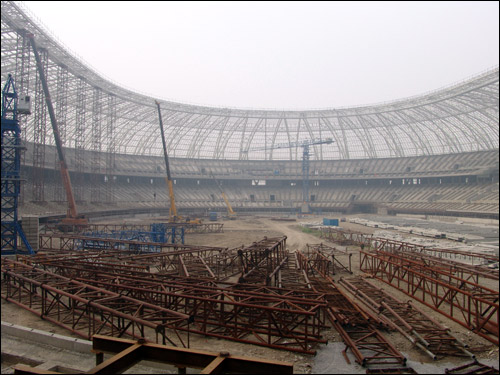 該體育場總投資約14.8億元,總建筑面積158000m2,觀眾坐席6萬個,建筑總高度53m。采用phc高強度混凝土預應力預制管樁、承臺地梁基礎,主體結構以鋼筋混凝土框架結構為主,局部鋼支撐圓柱及環梁采用勁性鋼骨結構。整個造型呈水滴型,落地式屋面結構由112榀主桁架、92根桁架柱和二道環向桁架組成,總重約1.3萬噸,屋頂采用玻璃及金屬屋面覆蓋。