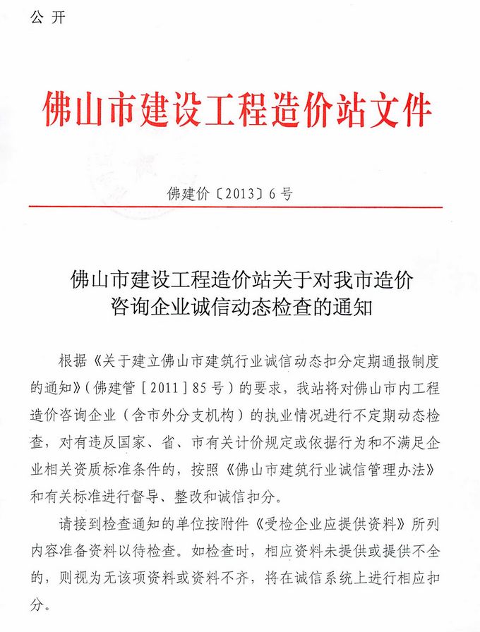 佛山市建設工程造價站關于對我市造價咨詢企業誠信動態檢查的通知