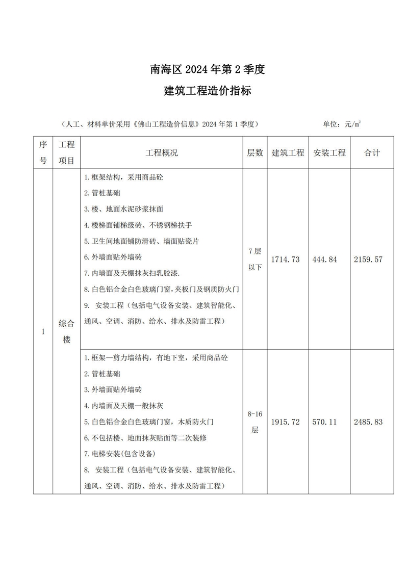 南海區(qū)2024年第2季度建筑工程造價(jià)指標(biāo)